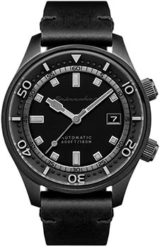Мужские механические часы с автоподзаводом. Калибр механизма TMI NH35. Центральные часовая, минутная и секундная стрелки. Апертура даты в позиции 3 часов. Черный циферблат. Круглый корпус выполнен из нержавеющей стали с черным IP покрытием. Диаметр корпуса составляет 42 мм, толщина 15 мм. Черный кожаный ремешок шириной 20 мм, стандартная застежка. Устойчивое к возникновению царапин сапфировое стекло с антибликовым покрытием. Водостойкость WR 180 (плавание и погружение).